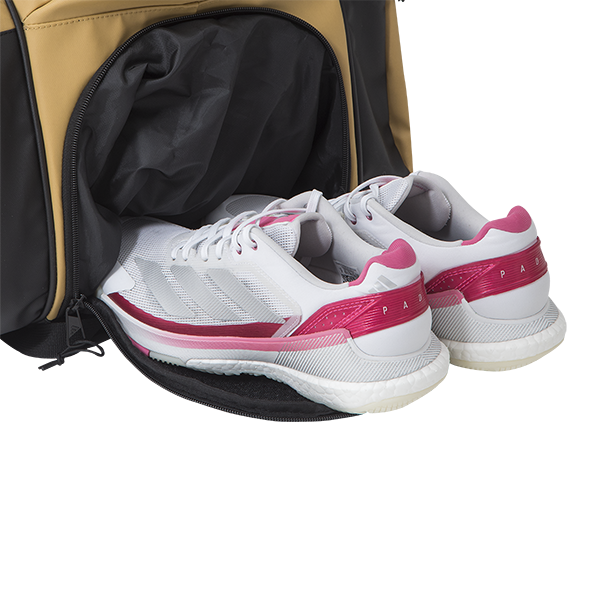 Discover the new padel bag designed for the most demanding players. Its innovative flap opening provides quick access to a spacious central compartment, perfect for carrying all your clothing and sports gear. The insulated side pockets protect your racquets, while the ventilated lower compartment keeps your shoes separate and aired out. It also features several narrow pockets to securely organize your personal items. Its adjustable straps and ergonomic handles make transportation comfortable and practical. A design made to accompany you in every match.
