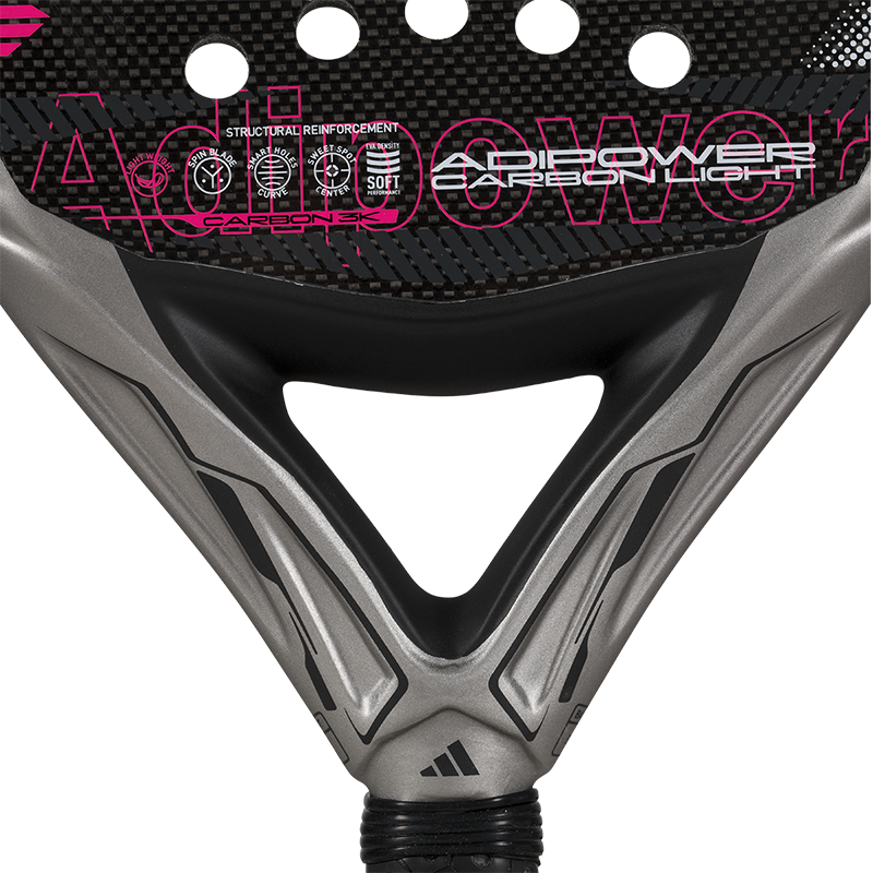 The Adipower Carbon Light is a racquet that combines the best technologies with a more agile grip, thanks to its lightweight design. The Dual Exoskeleton, featuring carbon reinforcements, and the Power Embossed Ridge in the frame enhance its rigidity for improved aggressive play. Additionally, the arrangement of the Smart Holes Curve and the 3D Spin Blade Mold texture provide optimal spin on all shots.