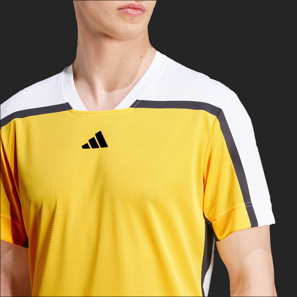 Maintain your intensity on the court during hot and humid conditions. This adidas t-shirt is made with HEAT.RDY to keep you cool and energized when the sun's beating down. Designed for players who don't stop, this tee offers unrestricted range of motion through the arms and shoulders so you can crush forehands and chase down drop shots. This product is made with 100% recycled materials. By reusing materials that have already been created, we help to reduce waste and our reliance on finite resources and reduce the footprint of the products we make.