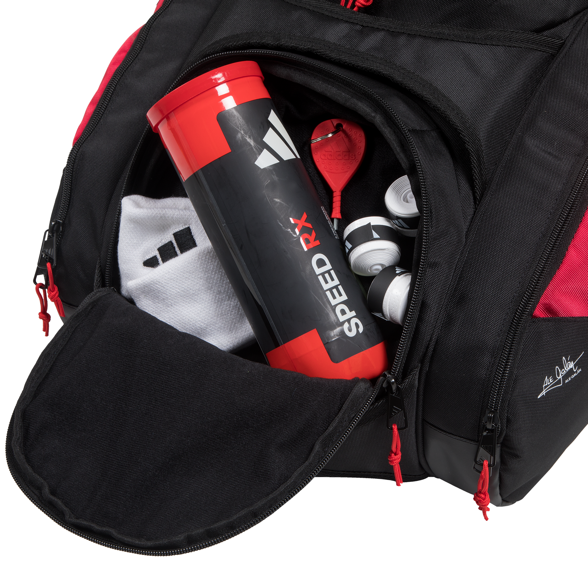 This large racketbag, featuring Ale Galan’s signature, is perfect for storing all your padel equipment. There is a large central compartment designed to store clothes, while the two side pockets with thermal insulation can hold up to two rackets each. In addition, there is a bottom compartment with mesh ventilation to store your footwear separately.