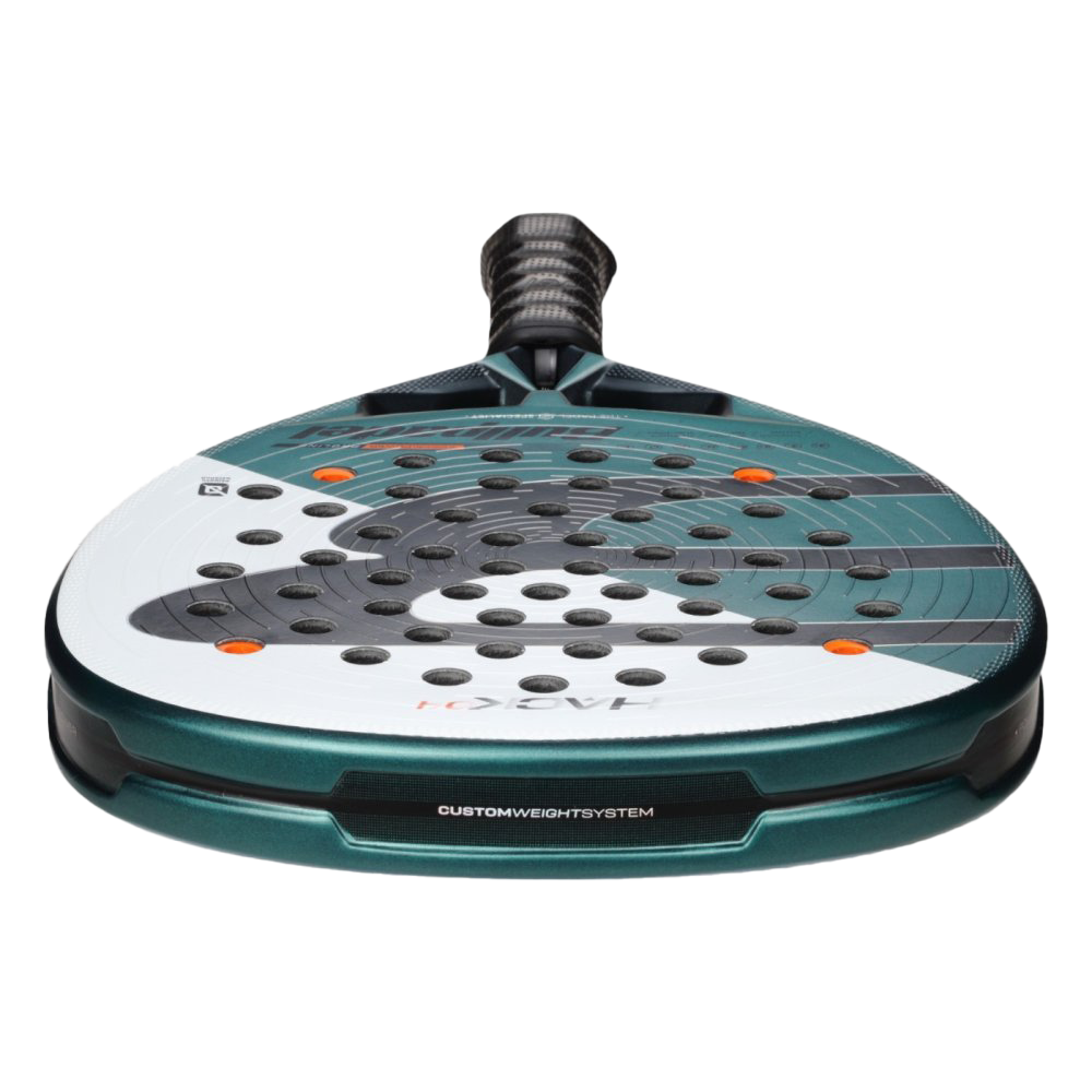 The distribution of holes in a padel racket plays an important role in performance, influencing factors such as control, ball exit, or power. The new hole pattern in the Hack 04 line has been redesigned with a concentric circle format that allows for a more balanced distribution, greater flexibility on the racket face, resulting in greater ball exit and a larger sweet spot.