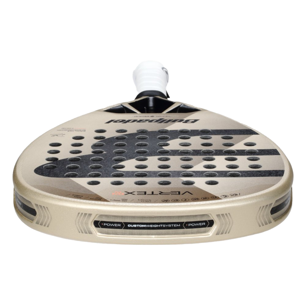 The Vertex structure is designed to accommodate up to 5 weights—4 on the upper part of the racket and one on the bottom cap weighing either 5g or 10g. With all of this, we can create different specifications with up to 22g more weight and a balance shift of ±1 cm.