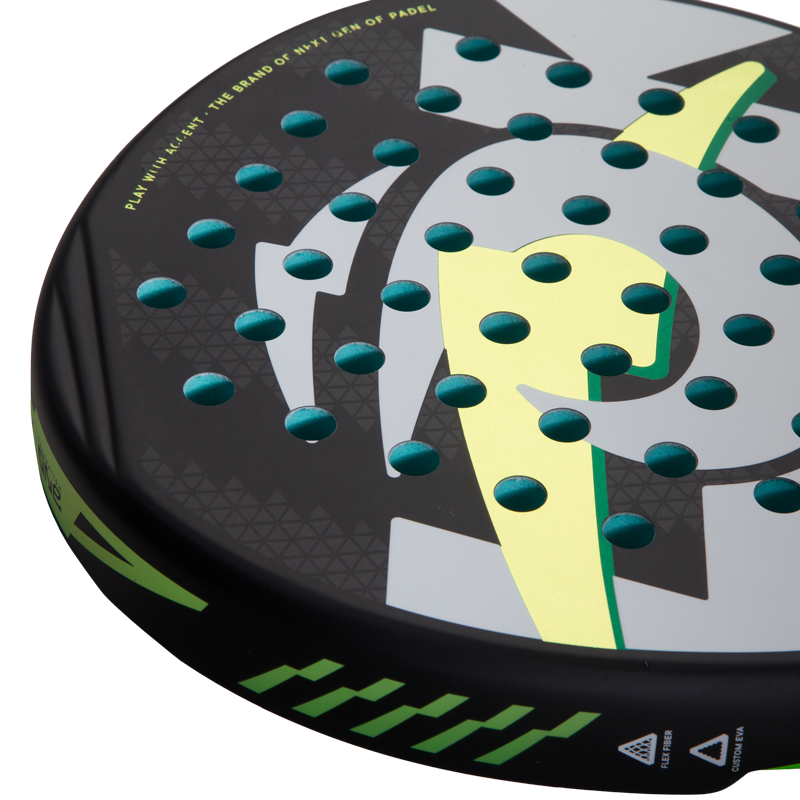The mixed carbon fiber surface ensures a high level of comfort while maintaining a focus on attacking play, thanks to its diamond shape and elevated sweet