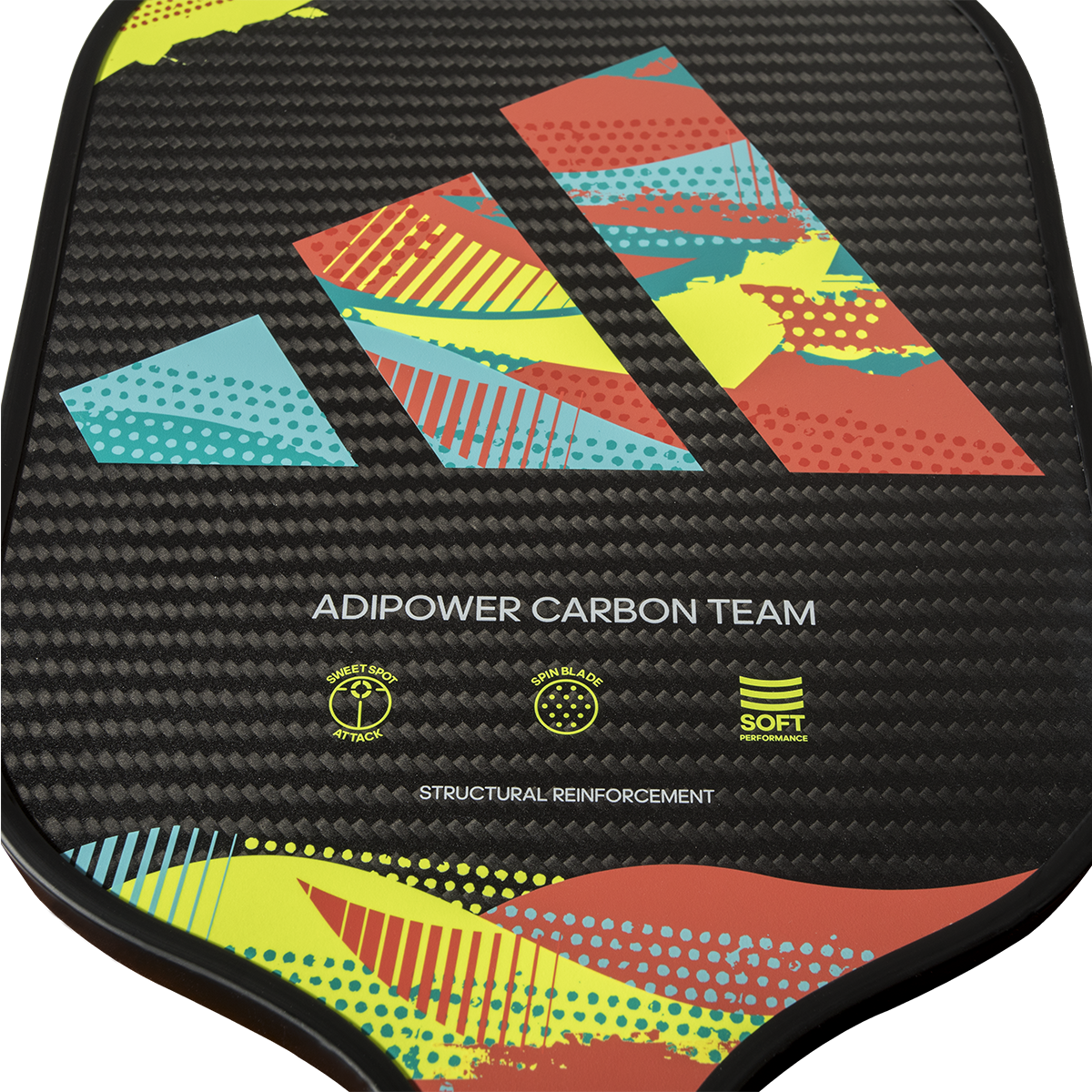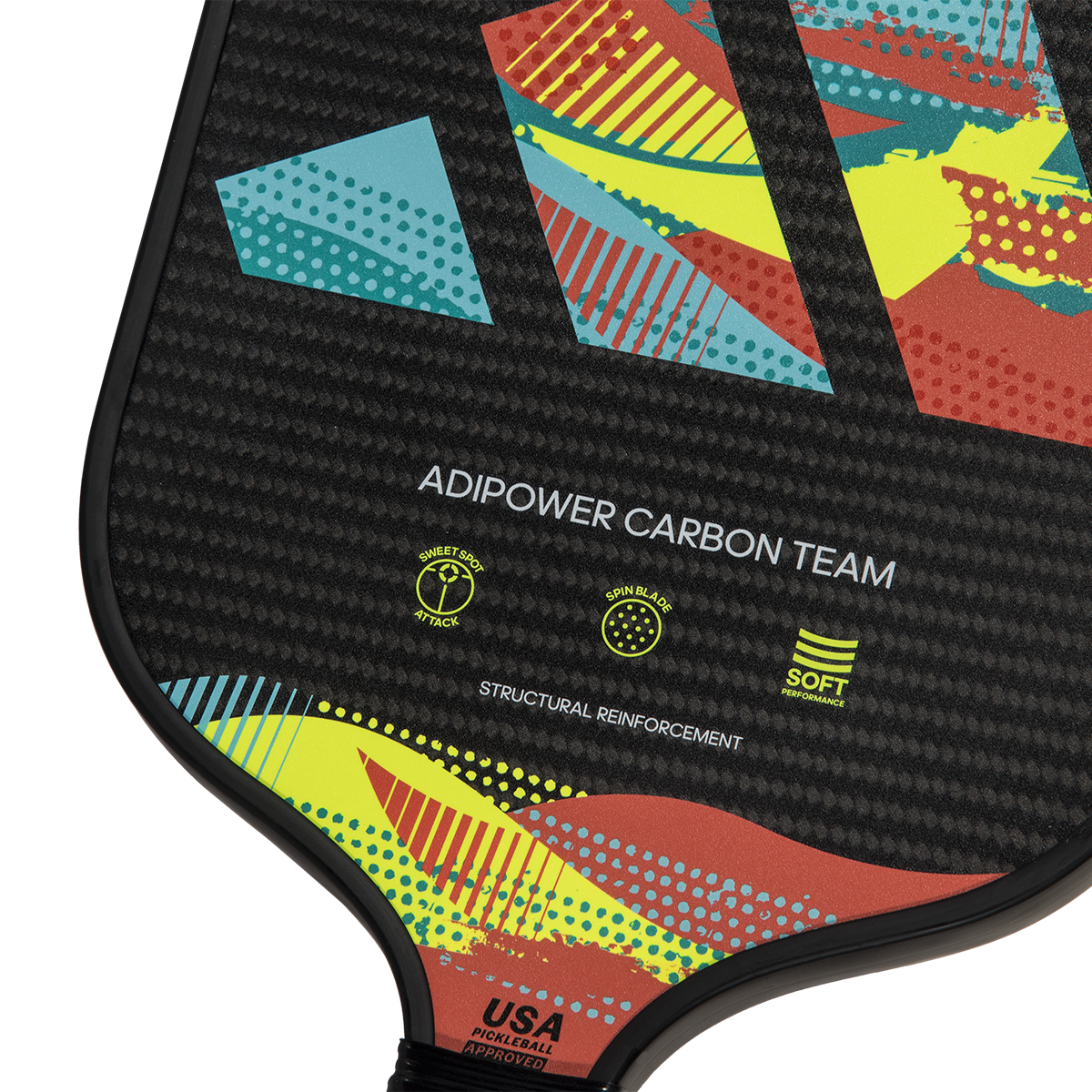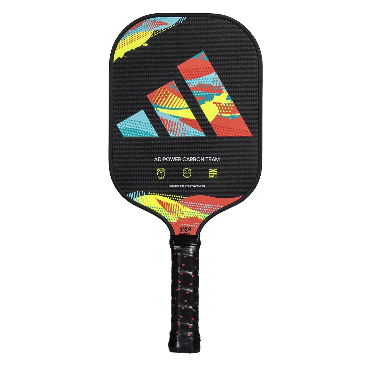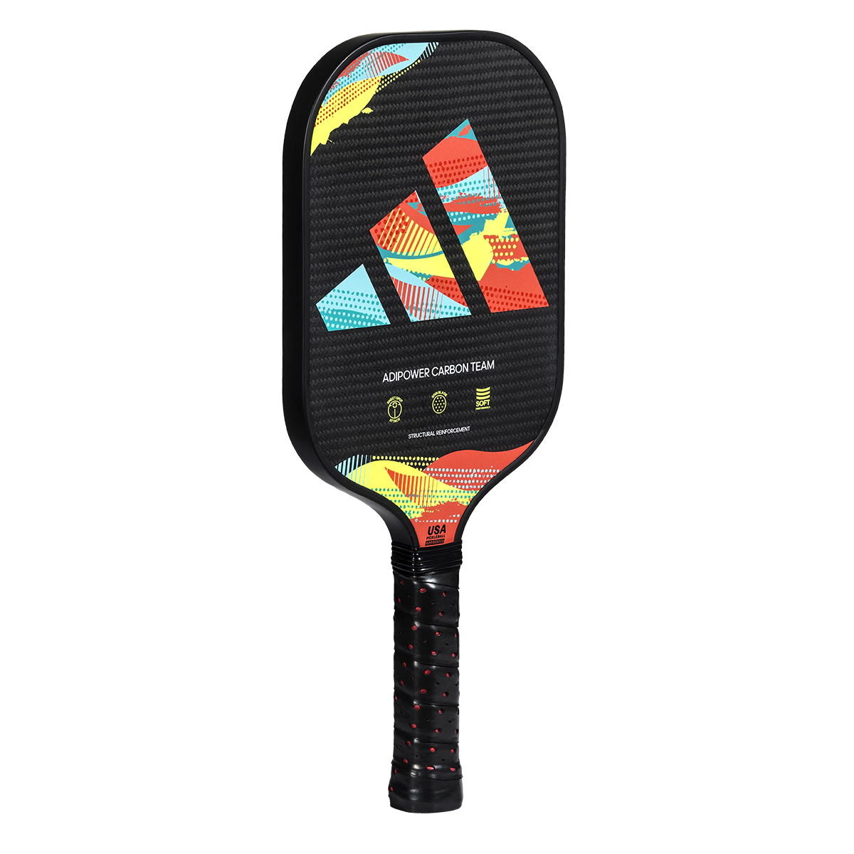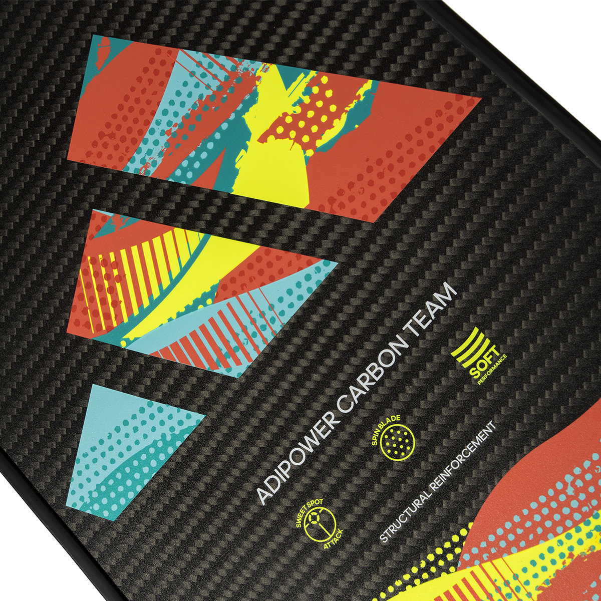 The Adipower Carbon Team is a racket that generates great expectations at first sight. And the best thing- playing with is confirm what you thought initially. Its characteristics and composition meet the needs of a top level pickleball racket. Its 16 mm thickness is one of its great attractions, offering greater ease of handling and a better feel when hitting. Its high balance and the rigid 3k Carbon fibre also guarantee the best reactions when playing in a more offensive way. Its design ensures to a tremendously complete racket. The variety of colours that flood the three stripes and the ends of the racket on the black background make for a fresh and innovative design. Are you ready to show it off?