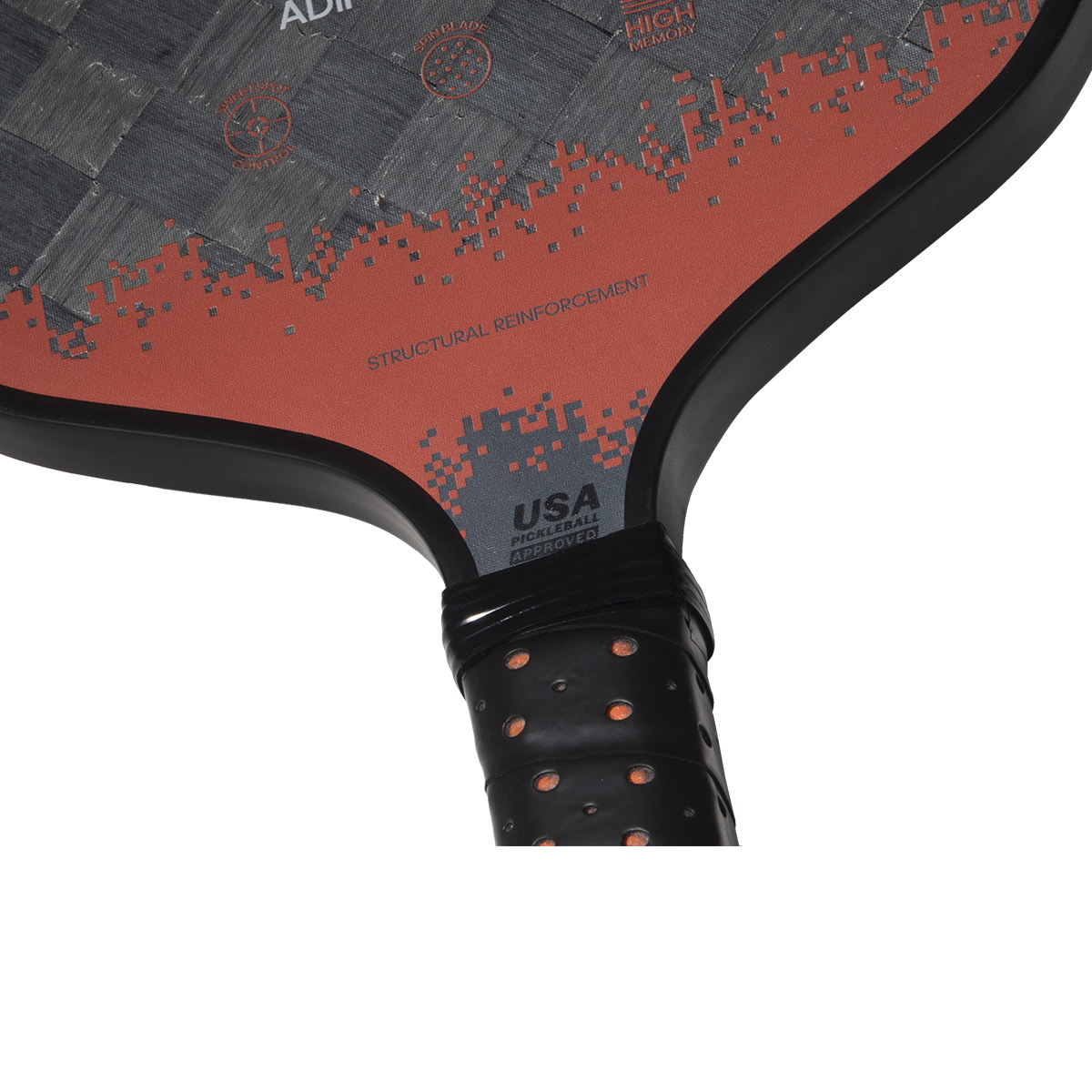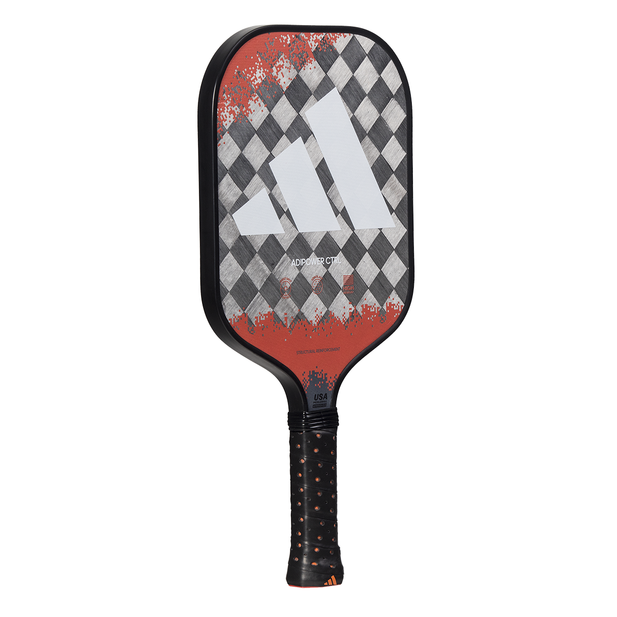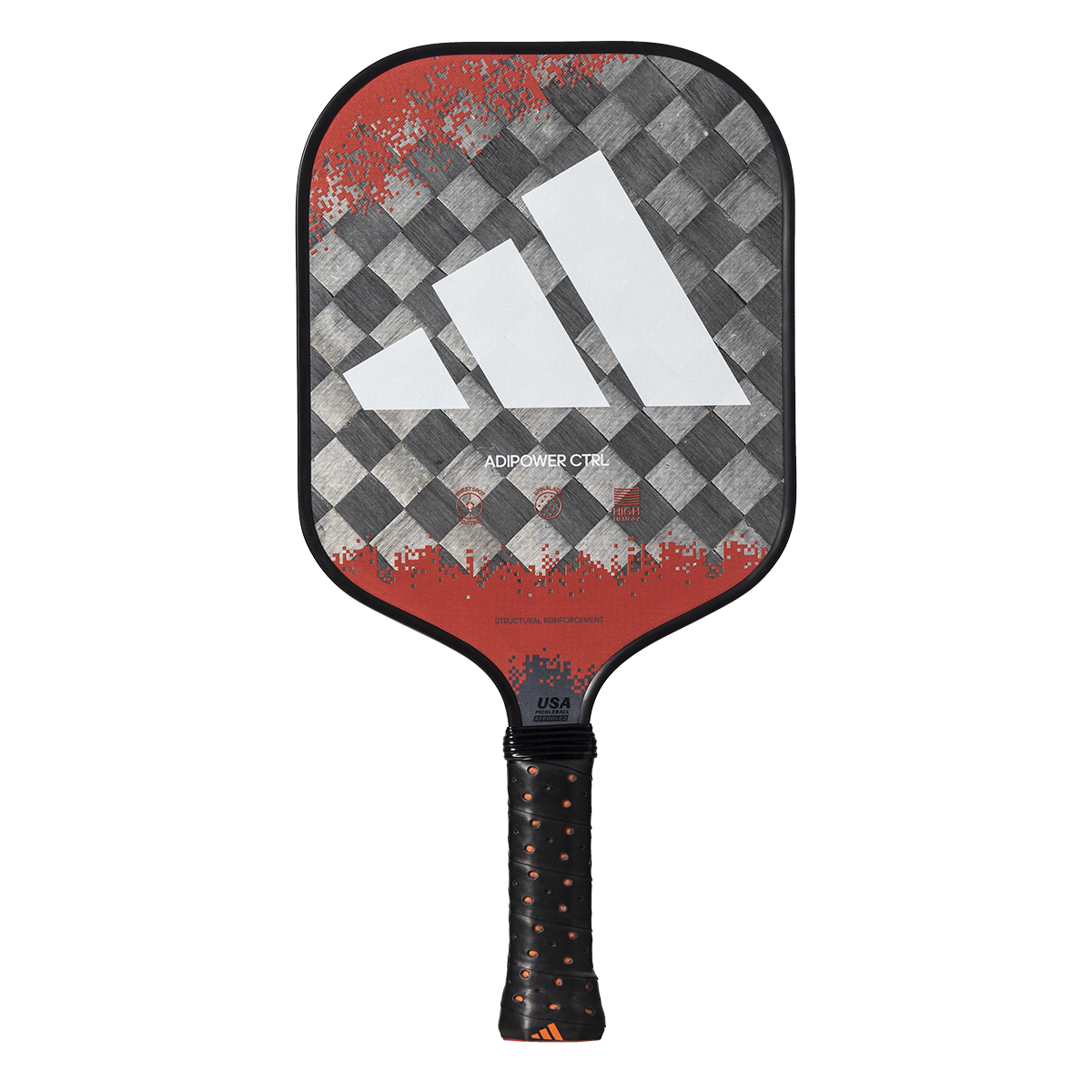 The Adipower CTRL combines the best features a pickleball racket can have. Designed for control, it also has many aspects to excel in attacking play. The racket has the perfect balance between handling and high performance. It is made of 24k Aluminized Carbon fiber, a material of great rigidity to play the most powerful shots when the moment requires it. One of its differential aspects is the Spin Blade Max technology, a rough layer incorporated in the surface that guarantees the best effects and rotation on the ball. Everything is encompassed in a racket with a spectacular design. The base color is a tinted red with different shades of grey, while white draws the three famous adidas stripes.